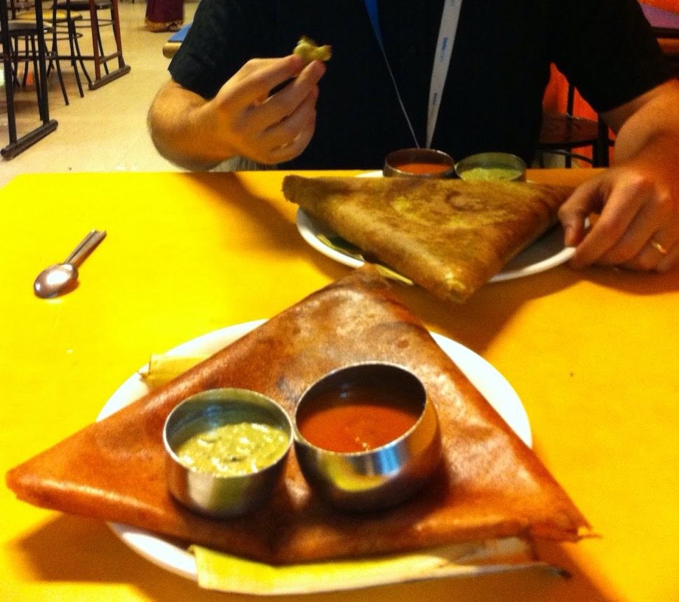 Tältä näytti masala dosa -annokset yhdessä Bangaloren tiedepuiston lounasravintoloista. Näissä annoksissa on lisukkeena korianterichutney (vihreä) ja sambar-keitto (punainen).